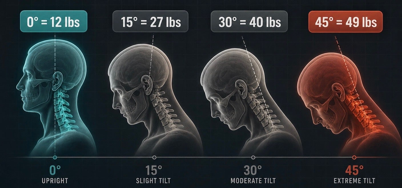 Think about it like this: the human head alone weighs anywhere from 10 to 12 pounds in a neutral position. For every inch it shifts forward, the load on the upper spine doubles. At just three inches tilted forward, your neck is absorbing the equivalent of more than 40 pounds of pressure.