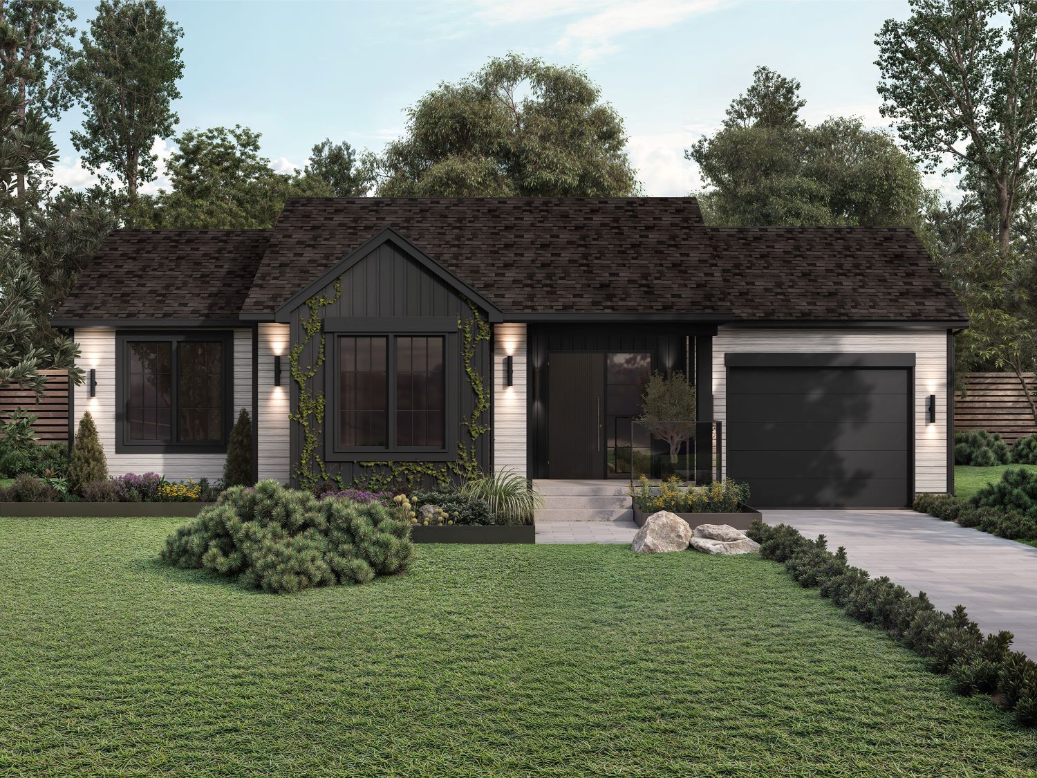 To achieve a contrasting effect, BP Canada suggests pairing white vertical siding and dark accents with shingles in shades of black, brown and grey. For a more uniform look, she proposes merging shades from the same colour family, such as light grey siding with dark trim and grey shingles.