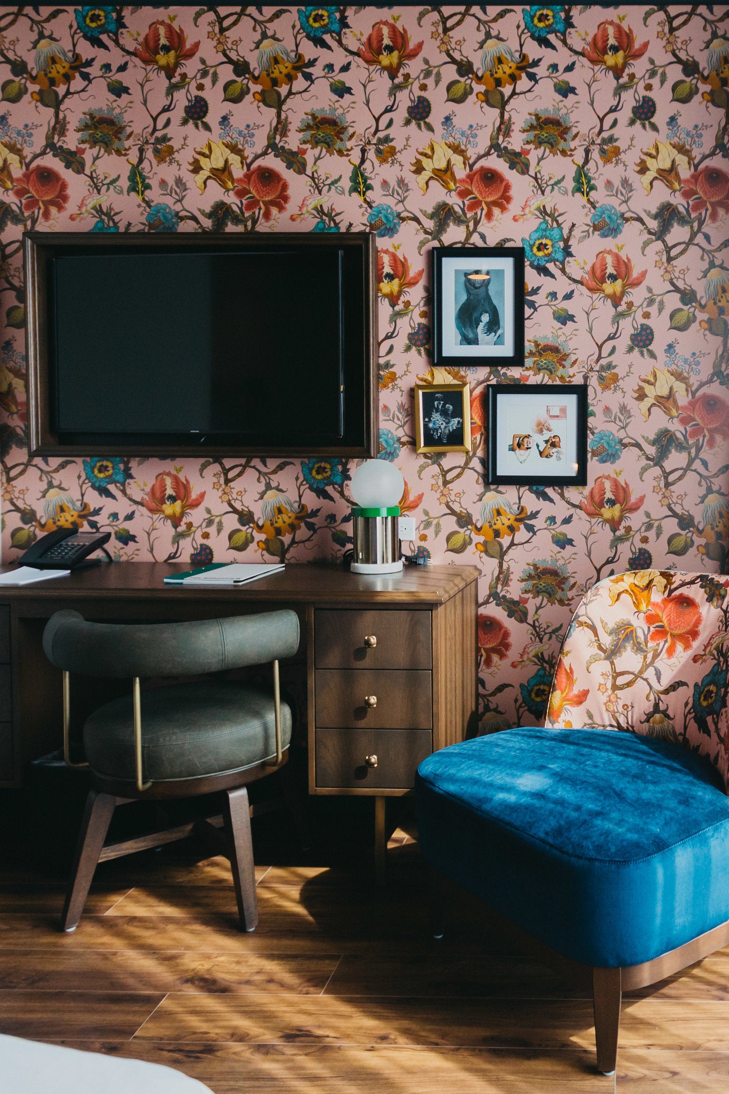 “The guest rooms are a variety of shapes and sizes, with a common aesthetic that again bridges old and new,” Petrie explains. “Layering colours, patterns and textures gives the rooms warmth – they are not generic neutral boxes.  House of Hackney’s Artemis pattern in Blush was selected for the wallpaper and velvet upholstery is found in many rooms, paired with deep burgundy velvet curtains.”
