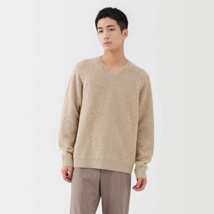 The Men’s Wool V-Neck Sweater is Muji’s idea of a modern workhorse knit: sharp, easy and made to be lived in. Crafted from fine, durable wool yarn, it’s soft against the skin yet structured enough to keep a clean line across the shoulders and torso. The mid-gauge knit balances warmth and lightness, so it slides under blazers, Chester coats or padded outerwear without feeling bulky.