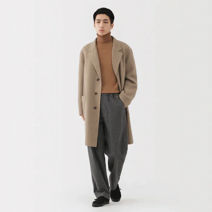 Muji’s Double Face Wool Blend Chester Coat is the outer layer that pulls the entire look together. Cut in a tailored Chester silhouette, it delivers that long, clean line associated with European overcoats, but with Muji’s distinctly quiet, everyday pragmatism. The fabric is a plump wool blend with a double-faced finish, meaning the material is brushed on both sides for a soft handfeel while remaining lighter than many traditional recycled-wool coats.