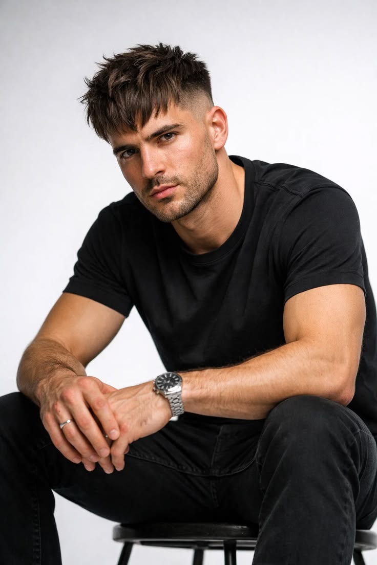 The French crop is the textured crop’s sharper, more defined cousin. The key difference is the fringe a short, forward-sitting fringe at the front that frames the face with intention. In 2026, barbers are pairing French crops with choppy texture and low fades for a modern edge that suits men of all ages. It’s also one of the best mens hair cuts for men with a receding hairline, as the forward fringe can minimize its appearance.