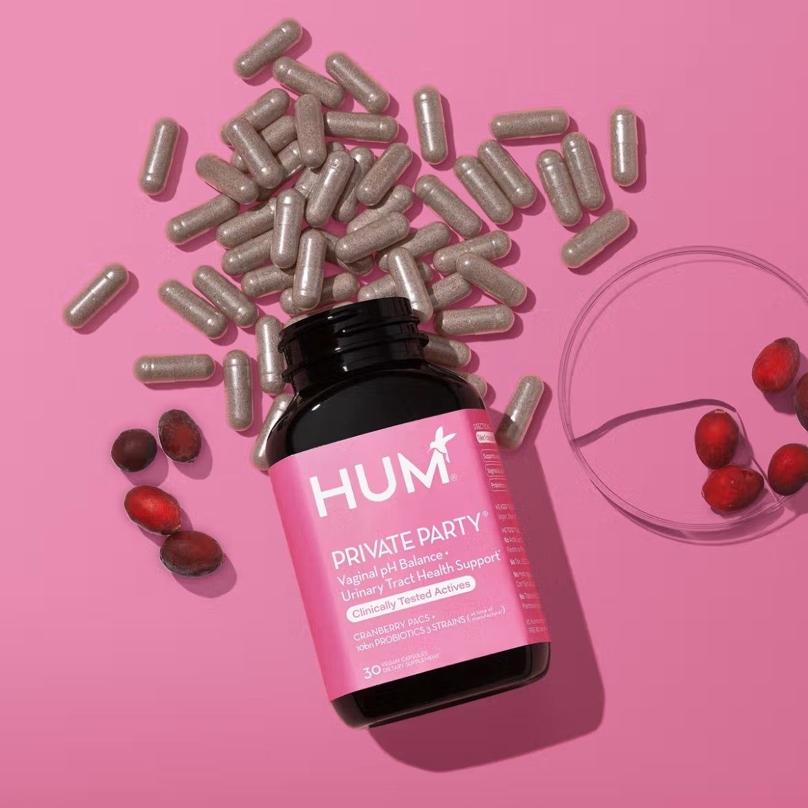 Private Party is a targeted “2-in-1” supplement crafted to support both vaginal microbiome health and urinary tract wellness. It includes three clinically studied Lactobacillus strains (L. acidophilus LA-14, L. rhamnosus DSM 33560, and L. reuteri UALre-16) which are known to contribute to a balanced vaginal pH and flora. Additionally, it features a cranberry extract standardized to deliver 36 mg proanthocyanidins (PACs) — a bioactive shown to support urinary tract health. The formula is vegan, gluten-free, Non-GMO, and free from artificial colours and sweeteners. Users report feelings of increased confidence “down there,” and it’s presented as a convenient one-capsule-daily option for adult women.