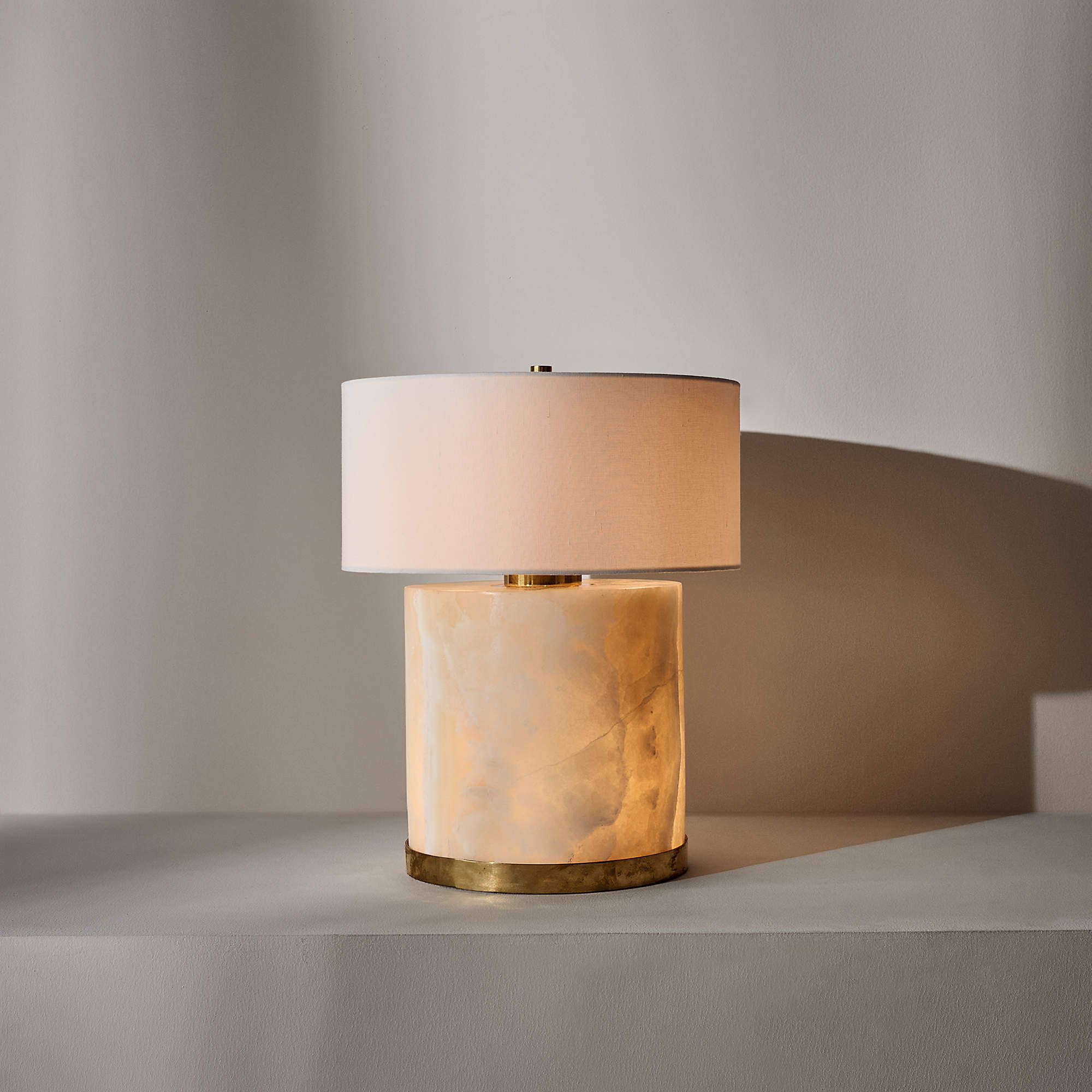 A sculptural accent piece that brings art‑meets‑light energy to your man cave setup, this Natalia Onyx Table Lamp is carved from solid polished onyx, giving each unit a one‑of‑a‑kind look as light softly radiates through the stone’s natural tonal variations. Designed exclusively for CB2 by Melbourne‑based studio VUUE, the lamp pairs creamy translucent onyx with aged brass accents for an elevated, luxury feel that suits both modern and eclectic spaces. The minimalist silhouette is grounded by a classic linen drum shade and warm, ambient glow, perfect for adding sophisticated mood lighting beside a leather sofa, game chair, or bar cart setup. Because the stone’s pattern naturally changes from piece to piece, no two lamps are exactly alike, making it a standout decorative object as well as a functional light source in premium entertainment spaces.